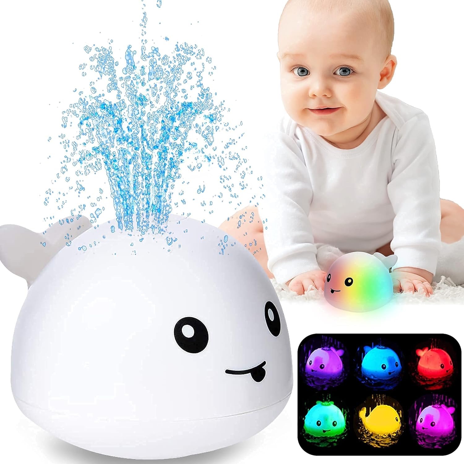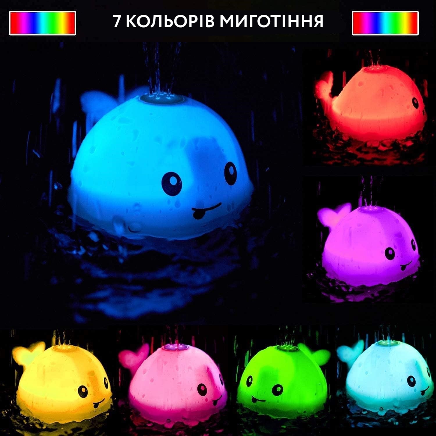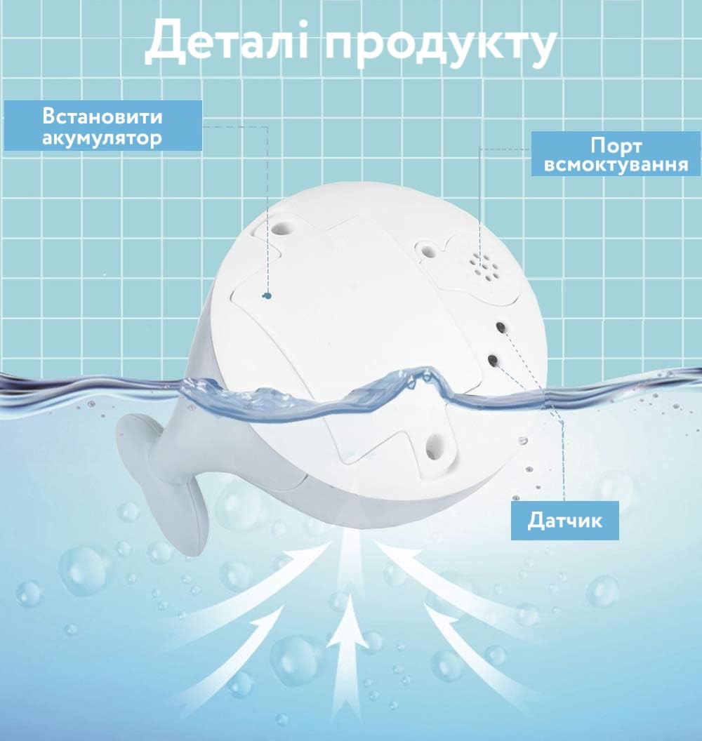 Іграшка у формі кита — ідеальний супутник для купання! Світиться різними кольорами та створює ефект справжнього фонтану, розбризкує воду, як у справжній кит. Яскравий, веселий та чудово розважає дітей,  робить час у воді незабутнім!
