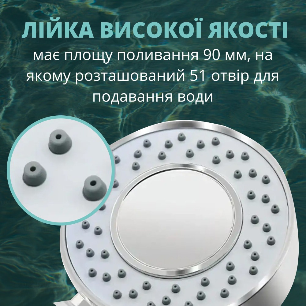 Multifunctional Faucet – лійка високої якості, що має площу поливання 90 мм, на якому розташований 51 отвір для подавання води, 3 режими роботи: розслаблювальний спа, масажний і змішаний. Шланг до комплекту не входить.