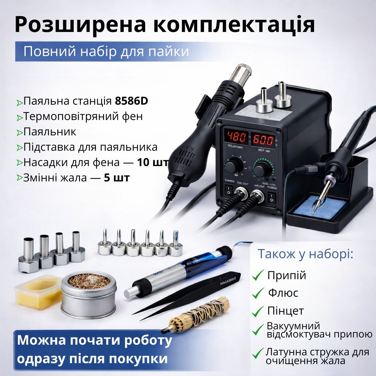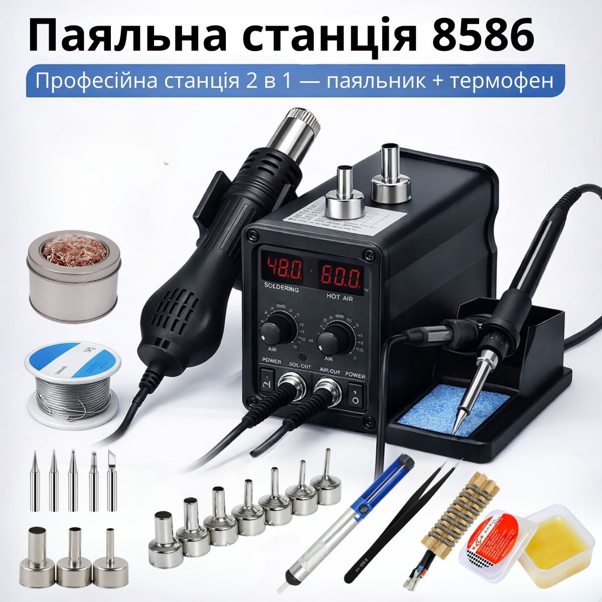 Паяльна станція 8586D — це універсальний пристрій 2-в-1, який поєднує паяльник та термоповітряний фен. Станція призначена для монтажу та демонтажу електронних компонентів, ремонту плат, паяння мікросхем і SMD-елементів, а також обслуговування мобільних телефонів, ноутбуків та іншої електроніки.