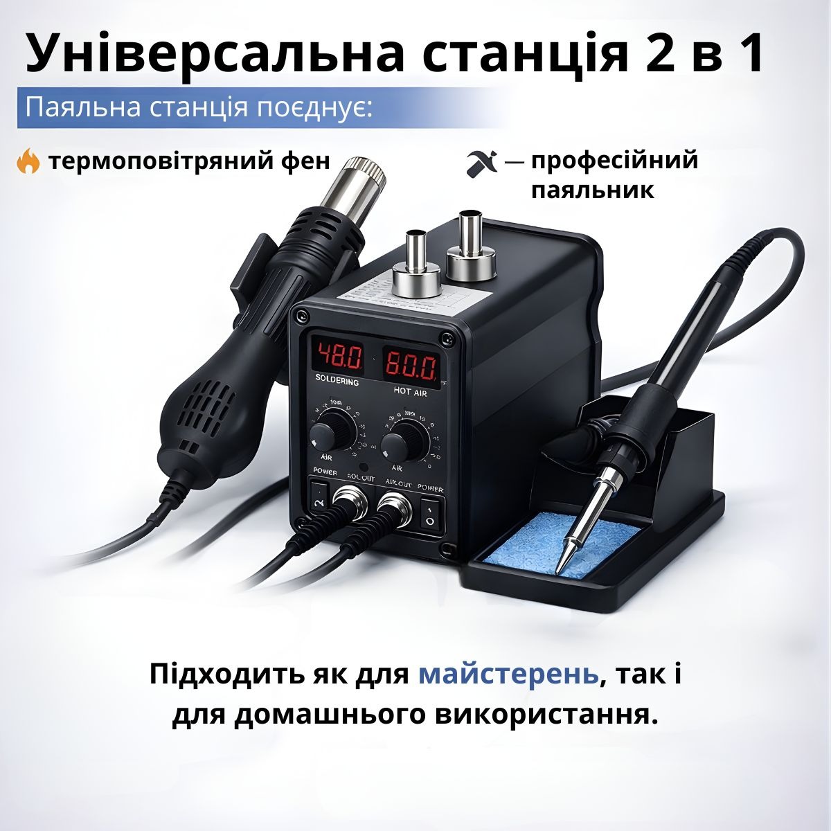 Тип пристрою: паяльна станція 2-в-1 (паяльник + термофен)