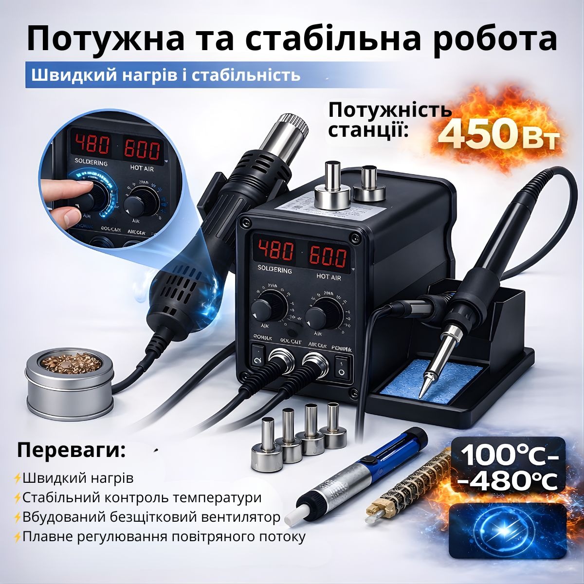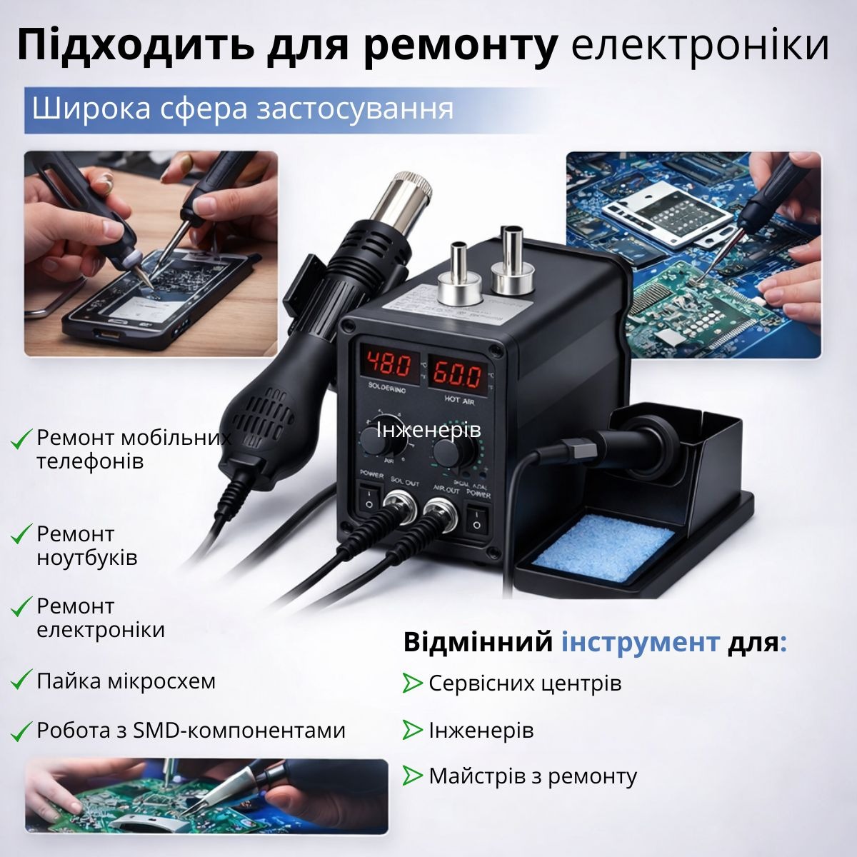 Станція відрізняється стабільною роботою, швидким нагрівом та антистатичним захистом, що особливо важливо при роботі з чутливими електронними компонентами.