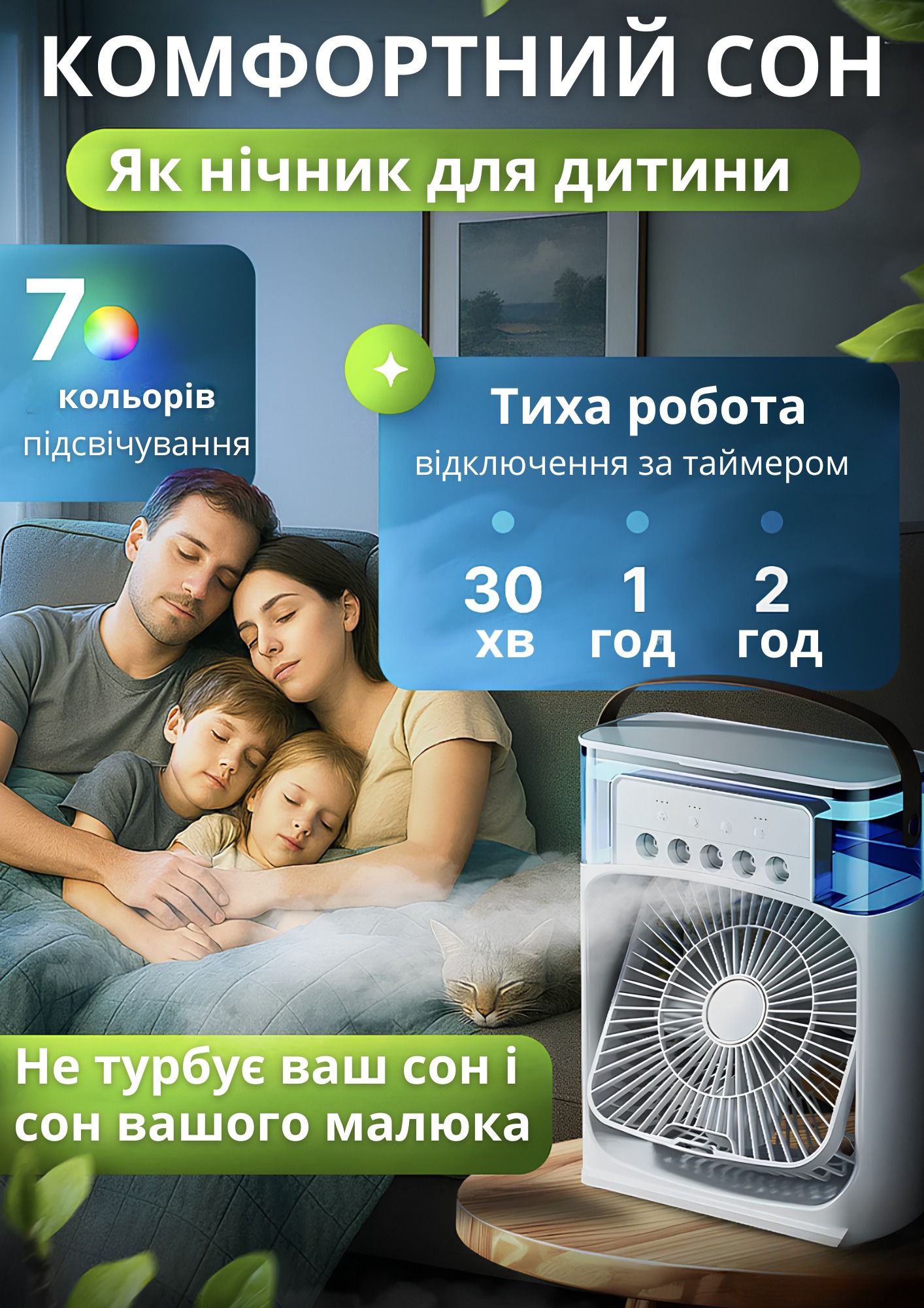 Компактний портативний кондиціонер 3в1 — вентилятор, зволожувач і охолоджувач повітря з яскравою LED-підсвіткою для комфорту вдома й у офісі